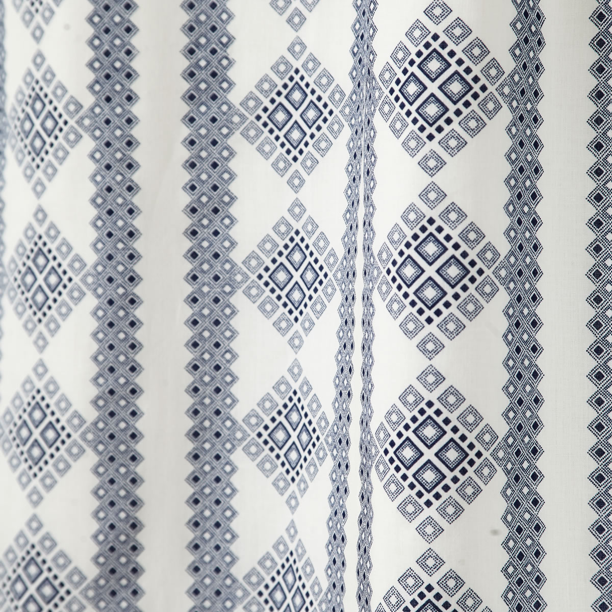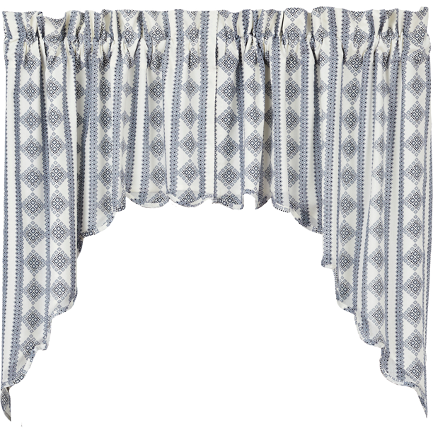 Blue and off white diamond pattern displayed in vertical stacks make this swag a feature on it's own.