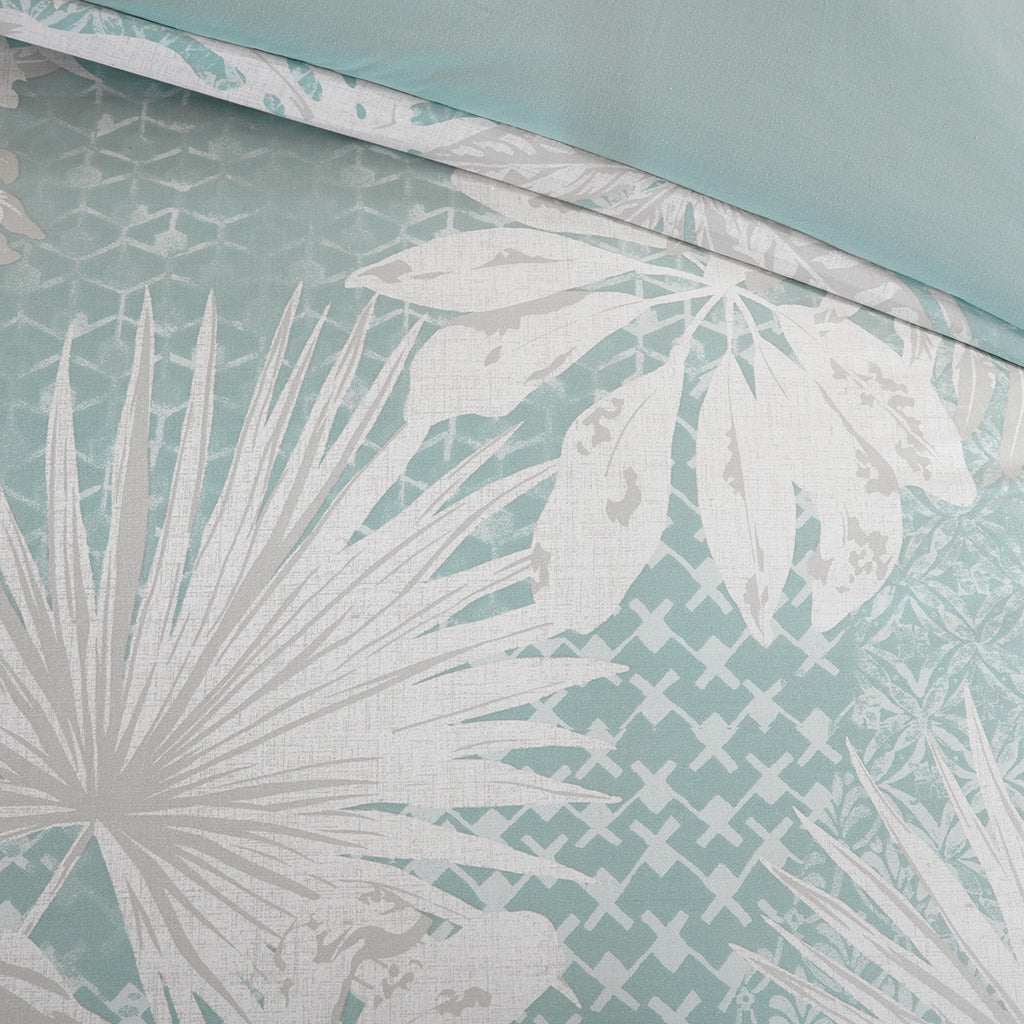 Transform your bedroom into a peaceful oasis with the Harbor House Palm Grove 6 Piece Comforter Set. A refreshing coastal pattern of lush palm leaves and ferns are elegantly showcased on a seafoam ground. The same coastal motif is reiterated on the oblong pillow using textured embroidery, while the square pillow features a colored palm tree on a soft, ivory ground. The solid coordinating bedskirt completes the look and provides a clean finish. Machine washable, this set includes 1 comforter, 1 bedskirt, 2 shams, and 2 decorative pillows. This bedding set is also OEKO-TEX certified, meaning it does not contain any harmful substances or chemicals, ensuring quality comfort and wellness.